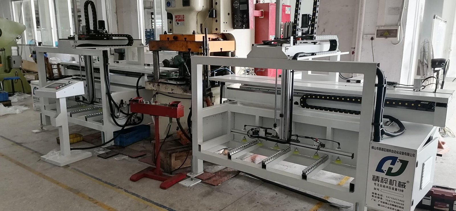 This machine is designed for the automatic loading/unloading of sheets for stamping and material palletizing. Developed in response to market demands, it incorporates high-precision guide rails, lead screws, a touch screen interface, and PLC control. It automates the entire workflow: automatic loading – automatic feeding – automatic stamping – automatic receiving – automatic unloading – automatic palletizing.